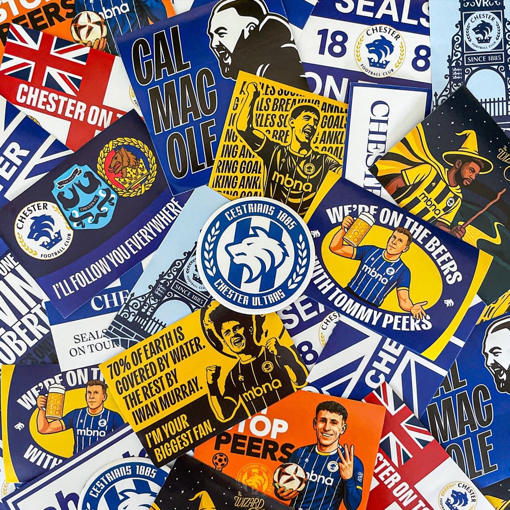 Mixed pack of Chester FC stickers. Available as a pack of 50, 100, 200 or 500.